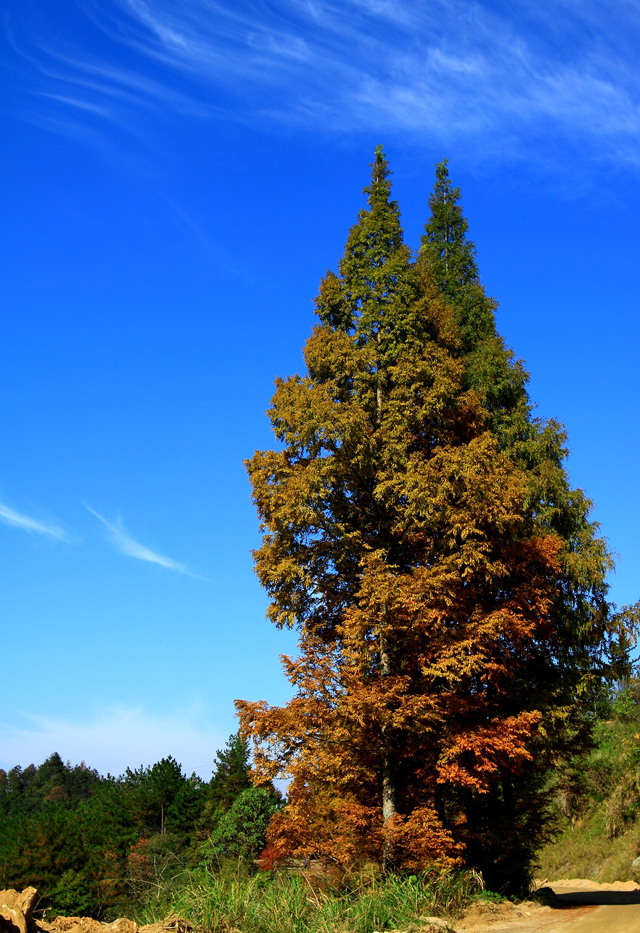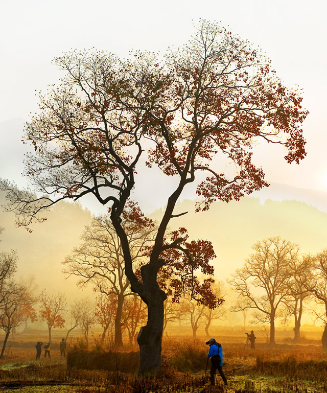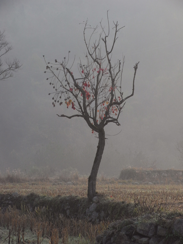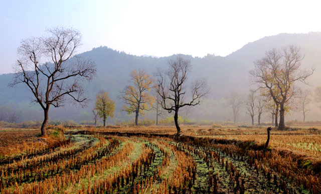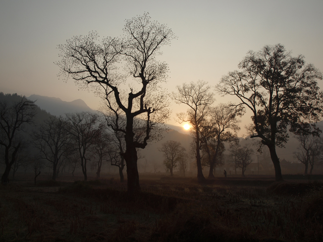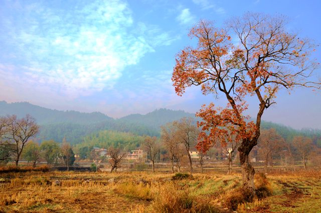 清晨的山村被晨雾笼罩,朦胧而静谧,宛若仙境;当阳光慢慢揭开雾的面纱,村庄开始苏醒,肥沃的泥土,整齐的稻茬,田埂上错落排列着火红的乌桕,枝干苍虬、身姿婀娜,秀丽的田园秋色呈现在眼前;灿烂秋阳下,远山更显巍峨,树上的叶子红得热烈、黄得明艳,给辽阔的田野泼洒上绚烂的色彩,人们辛勤地忙碌着活计,一派祥和景象;当夕阳西下,落日余晖映照下的村庄与田野变得柔和而安宁,别有一番温馨恬淡的感觉,使人心神宁静、流连忘返。