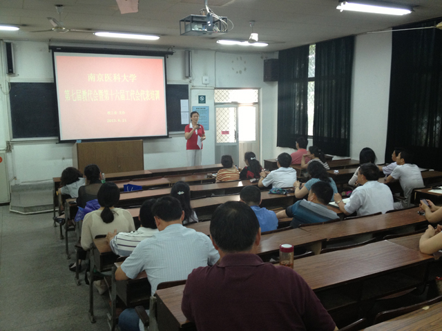 2013年6月21日下午,南京医科大学第七届教代会暨第十六届工代会(以下简称“双代会”)代表培训会在五台校区3号楼101教室召开,培训由校工会副主席王丽雅主持,分管工会校领导、纪委书记冷明祥主讲,56名新当选的“双代会”代表参加了培训。
