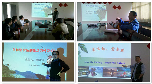 理论学习共设四次讲座,分别为郑爱明老师主讲的《垂钓的魅力》,王继庆老师主讲的《传统钓法》,魏钦俊老师主讲的《淡水钓常见目标鱼的习性与钓法》,刘文涛老师主讲的《爱飞钓 爱生活》。