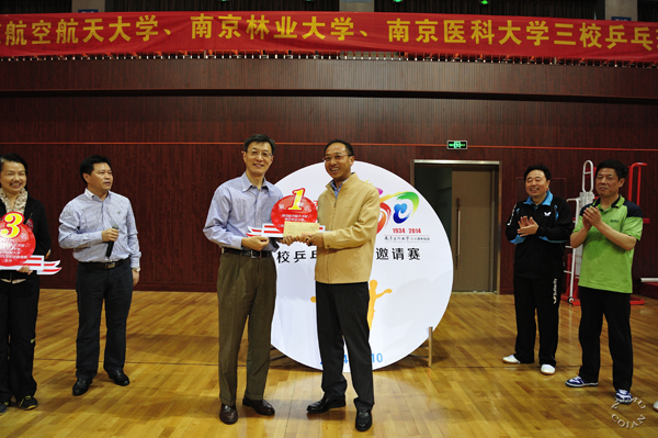 经过3个小时的激烈比赛,南京航空航天大学获得了本次三校乒乓球友好邀请赛团体总分第一名。党委书记陈琪同志为此次比赛的冠军团队颁发了奖牌。