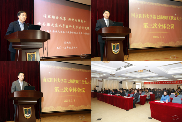 沈洪兵校长作了题为《深化综合改革 提升治理能力 全面推进高水平医科大学建设进程》的2014年度行政工作报告。报告从八十周年校庆系列活动、教育教学和人才培养、队伍建设和国际交流、学科建设与科学研究、附院建设与社会服务、综合管理和支撑保障等六大方面翔实总结了2014年学校工作的主要成绩,阐明了2015年工作的四点思路:全面深化综合改革,促进内涵式发展;增强社会服务能力,加大开放办学力度;提高综合治理能力,推动幸福校园建设;启动“十三五”发展规划的编制工作。