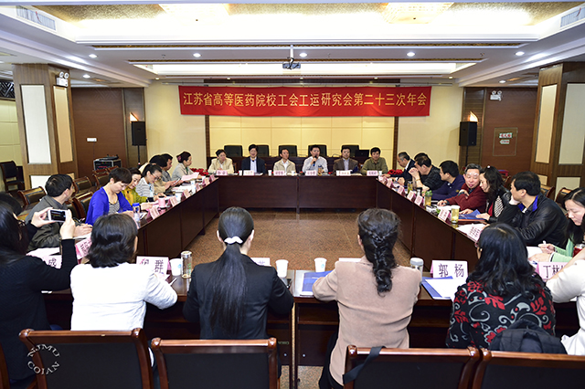 2015年4月25日,由我校承办的江苏省高等医药院校工会工运研究会第二十三次次年会在南京召开。来自省内11家高等医药院校工会的近30名代表参会,江苏省教育科技工会主席胡雪春、副主席孙焱、高校部部长高顺岭莅临会议,我校党委副书记石金楼、江苏大学党委副书记、纪委书记许化溪、南京中医药大学原党委副书记马家忠出席了会议。会议由会长单位南京中医药大学工会主席主持。