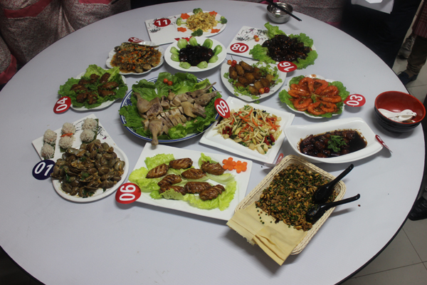 有十余位教职工参加了个人厨艺展示大赛,个个精神饱满,胸有成竹,厨艺程序有条不紊,动作娴熟。挥铲舞勺,热油、翻炒、调味,整个现场菜香扑鼻,他们精湛熟练的厨艺令人赞不绝口。最后一个大菜的盛盘将本次厨艺大赛推向了一个欢呼的高潮,一道道精美的菜肴呈现在评委和观众的面前,“盐水鸭”、“油焖大虾”、“糖醋排骨”、“可乐鸡翅”、“辣炒花蟹糯米丸”等等,色、香、味、形俱佳。