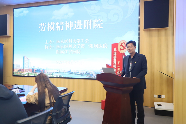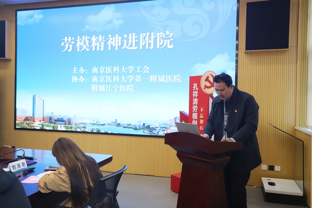 4月25日,由学校主办,第一附属医院、附属江宁医院协办的“劳模精神进附院”活动在附属江宁医院举行。活动邀请了江苏省先进工作者、第一附属医院心内科主任、附属苏州医院党委书记孔祥清教授作《躬身为民,抬头看路》主题报告。江苏省教育科技工会副主席崔文华,校党委副书记王瑞新、附属江宁医院党委书记丁政、校工会、附属江宁医院相关部门负责人、孔祥清劳模创新工作室联盟主要成员及师生代表出席活动。
