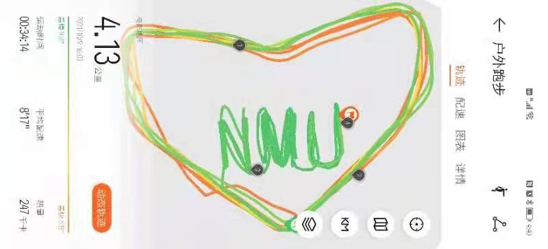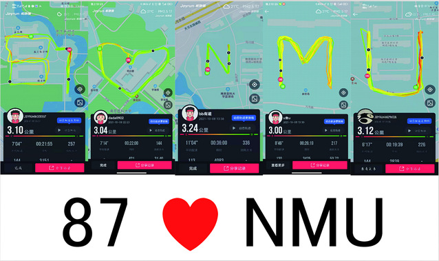 结合疫情防控要求,此次活动由参与教职工自行拟定路线并分散进行。在完成常规健身行的基础上,活动鼓励参与者对行进路线加以规划和趣味设计,呈现出致敬百年、强国有我、我爱你中国、87❤NMU等主题创意图案,在校内掀起了健步晒图的热潮。