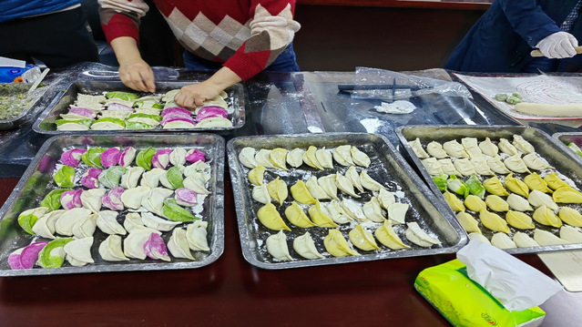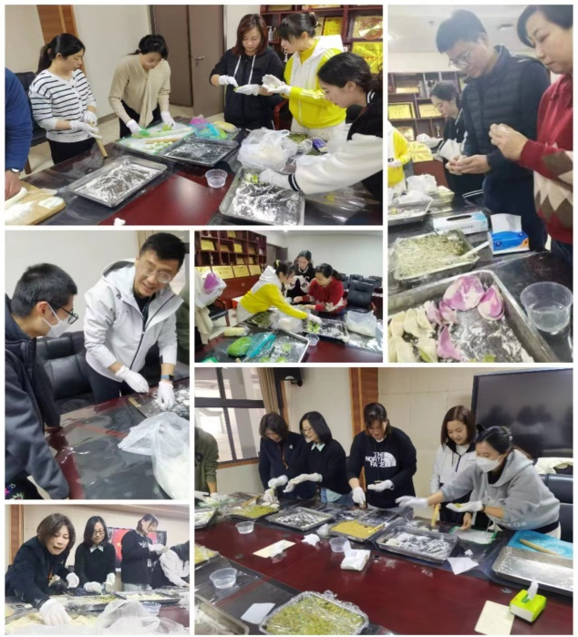活动现场,每位老师分工有序,擀皮、包馅、烧水、摆盘,各自大显身手。大家将饺子设计成绿白菜、金元宝、小笼包等别出心裁的花样,在比拼创意之余不忘相互切磋和交流。在老师们的通力协作下,一碗碗热气腾腾的手工水饺被端上餐桌,大家在分享美味的同时也充分体验了劳动的光荣和欢乐。
