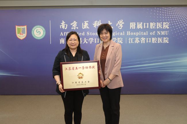 寇芳主席现场为附属口腔医院颁发2023年江苏省五一劳动奖状的奖牌和证书,口腔医学院、附属口腔医院党委书记徐艳代表医院领奖,并表示医院将以此次获奖为契机,珍惜时代赋予的光荣使命,团结拼搏、再创佳绩。