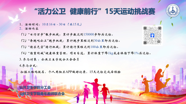 “15天运动挑战赛”由学院分工会与青年教师联合会共同举办,参与者需在15天内完成每日运动打卡,涵盖跑步、健身操、瑜伽等多种形式供教职工自由选择。活动期间,大家相互鼓励、共同进步,在运动中收获了健康与快乐,也养成了坚持锻炼的良好习惯。