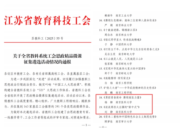 近日,江苏省教育科技工会公布2025年全省教科系统工会思政精品微课遴选结果,我校辅导员杨柳老师的《勇担青春使命 庚续南医力量》、刘静老师的《谈谈那些火出圈的“新中式”》微课成功入选,充分彰显了我校在思政育人领域的扎实积淀,也展现了我校教师队伍的深厚育人素养。